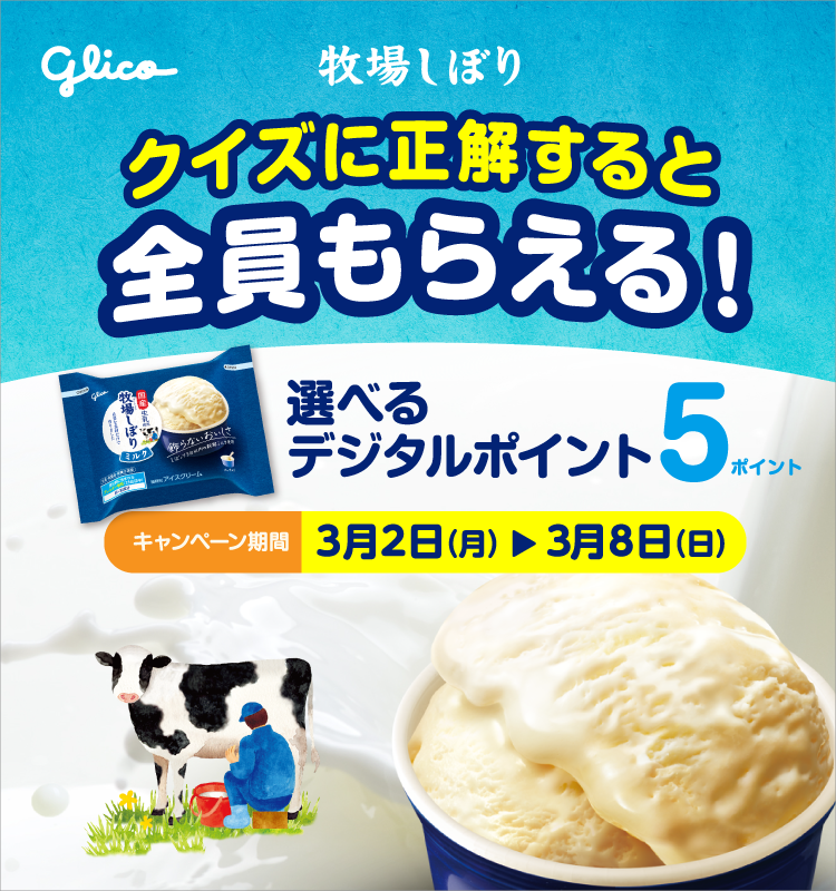 江崎グリコ株式会社(以下「当社」といいます)が実施するキャンペーン「牧場しぼり クイズキャンペーン」(以下「本キャンペーン」といいます)にご応募いただく前に、本規約をよくお読みください。なお、本キャンペーンにご応募いただいた方(以下「応募者」といいます)は、ご応募いただいた時点で、以下の内容にご同意いただいたものとみなします。